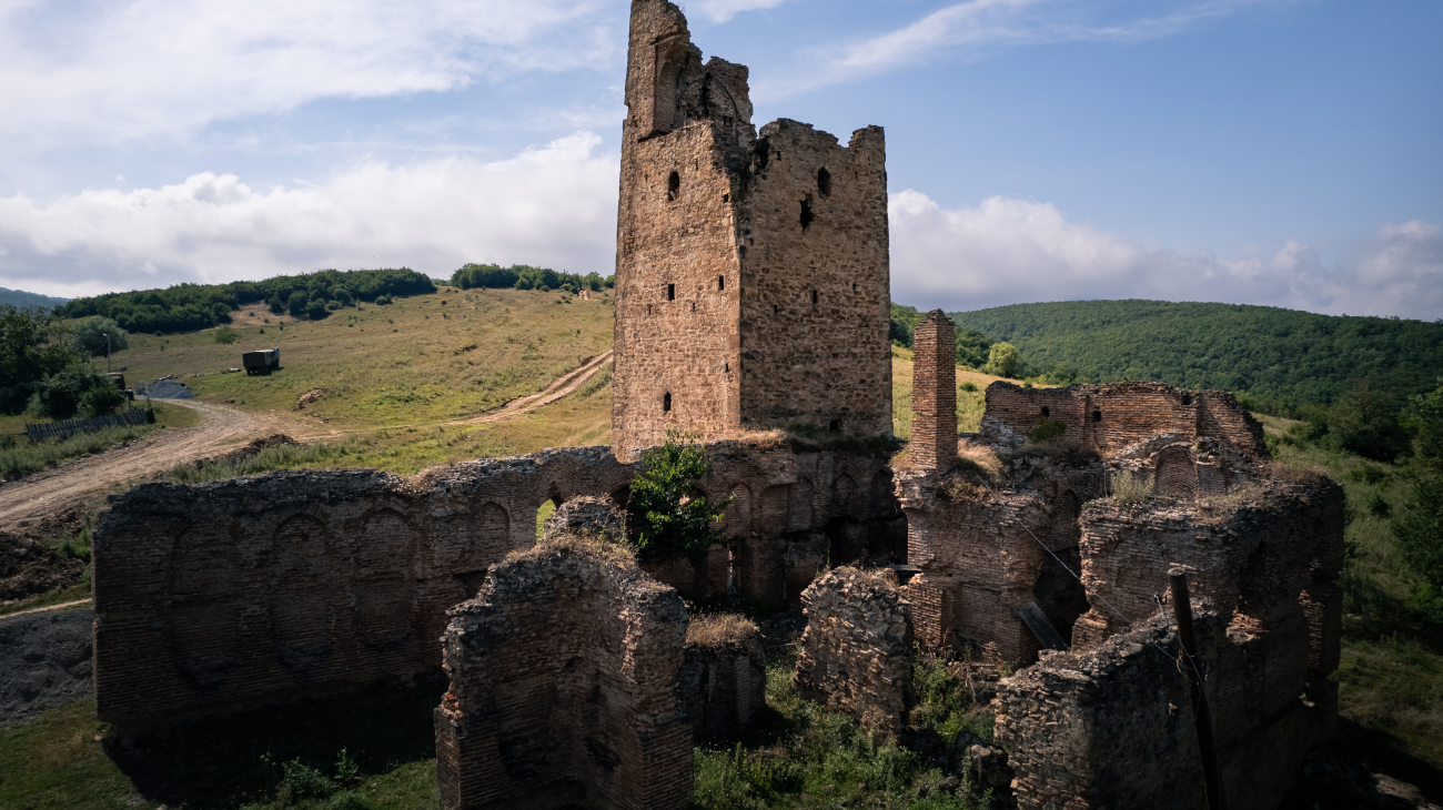 Семиэтажная башня – редкий образец фортификационного сооружения. Первый этаж башни глухой. Во втором этаже в середине северной стены находится вход. К входу снаружи пристроена лестница, которая соединяла башню с дворцом. В западной стене устроен камин. Как видно, камины были устроены на каждом этаже, в разных стенах. Бойницы устроены, начиная с третьего этажа, на всех этажах. Междуэтажное деревянное перекрытие не сохранилось, но есть фрагмент перекрытия седьмого этажа. Башня возведена из бутового камня, а свод и подпружные арки – из кирпича. Дворец феодала к башне пристроен с северной стороны. Памятник лежит в руинах. Можно определить, что план здания был четырехугольным. Здание было разделено на три части; посередине находился огромный зал. Дворцовые помещения имели сводчатое перекрытие. Стены здания возведены из булыжника и кирпича, а своды и конструктивные части – из кирпича. Остальные здания дворцового комплекса не уцелели.